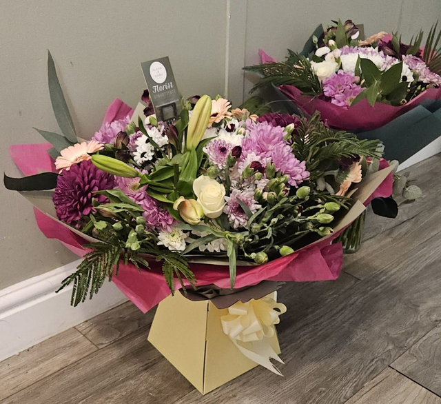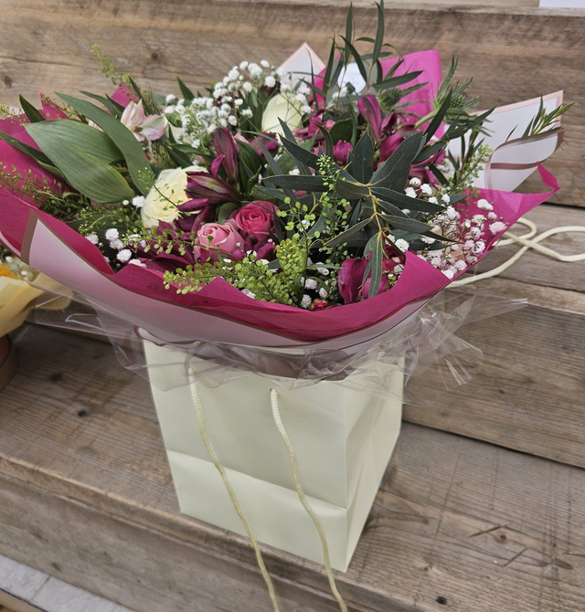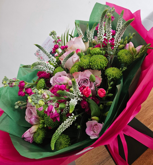 A beautiful hand tied bouquet, gift wrapped in a presentation box with an aqua pack. Featuring the florists choice of fresh seasonal blooms. THIS IS A PRE ORDER FOR DELIVERY ON SATURDAY 14TH MARCH, OR SUNDAY 15TH MARCH